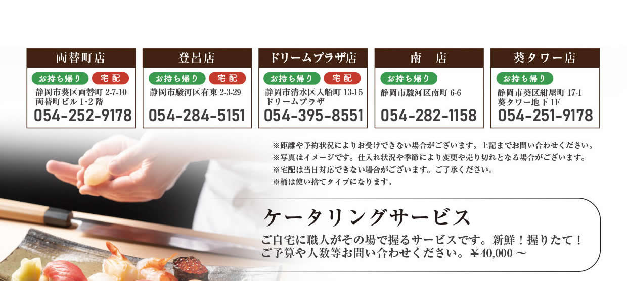 静岡市葵区両替町2-5-3 入船ビル5階 ■TEL:054-252-9178 ■FAX:054-253-2330 両替町店・南店のご予約は本社へお願いします。